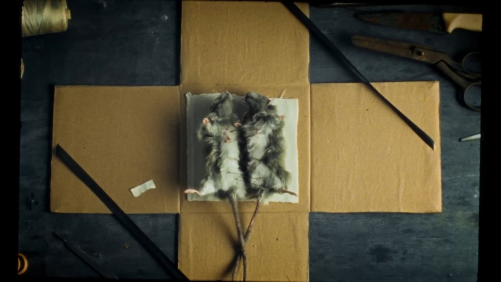 En el videoclip, por otro lado podemos ver un regalo que debe estar preparando el chico, dos ratas unidas a la fuerza con hilo de coser.