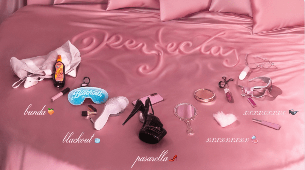 Emilia aprovecha pausas entre canciones para promocionar un producto ficticio relacionado con la temática de cada track, como un aceite para tener “una bunda elevada, una autoestima recargada”, una mascarilla de hielo para cuando «te pasas de hot», unos tacones incómodos a la par que icónicos, un maquillaje para que tu cara brille y, por último, vemos a la cantante haciendo promo de su contenido en redes.